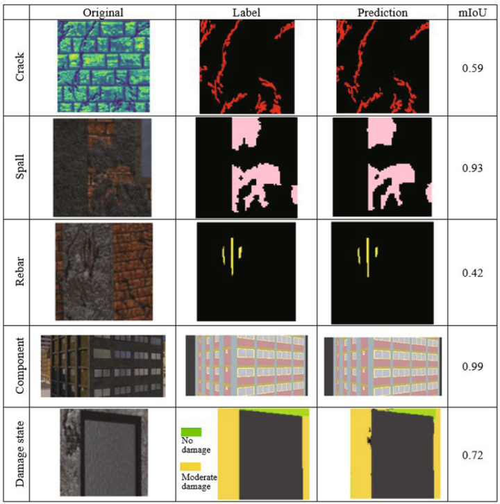 Buildings undergo various kinds of structural damage during earthquakes, and damage detection and functional assessment of these structures in the aftermath of the events have been challenging issues. Under these circumstances, computer vision techniques offer a promising solution by automating the inspection process. This study presents an effective methodology for automatic structural components and damage detection using unmanned aerial vehicle (UAV) images of damaged buildings. Two types of neural network architectures are considered for appropriate feature extractions in different task detections. The feature pyramid network (FPN) is employed for crack, spall, rebar, and component damage segmentation, while the UNet++ network is utilized for the damage state. For network training and validation, a total of 3805 original images of size 1920×1080 pixels are processed by the proposed method and reduced the image pixels. From the FPN, the achieved highest intersection over unions (IoUs) were 0.59, 0.93, 0.42, and 0.99 for crack, spall, rebar, and components, respectively. These predicted labels were found in close agreement with the labels. Similarly, the UNet++ recognized the semantic information and damage state with an IoU of 0.72. This demonstrated the applicability of the proposed method for automated post-earthquake building inspection process accurately without information loss from the original images.